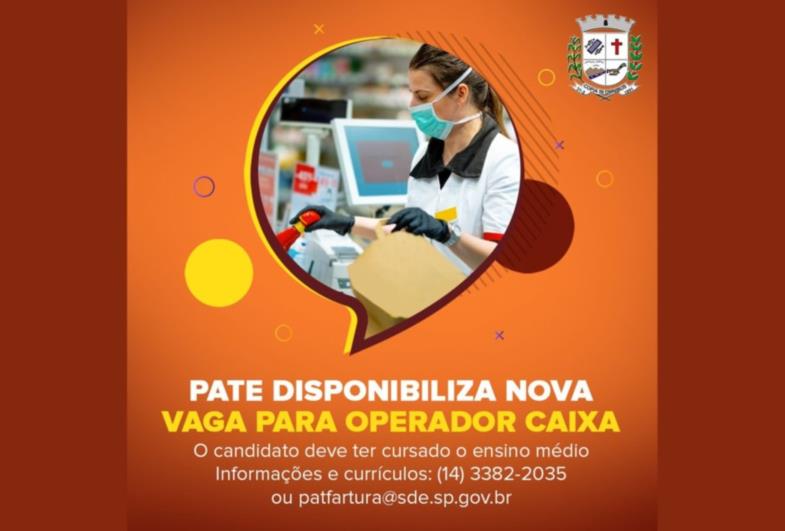 O Posto de Atendimento ao Trabalhador e Empreendedor (PATE), de Fartura, está disponibilizando uma vaga para interessado em trabalhar como Operador de Caixa. O candidato deve ter cursado o ensino médio. O salário inicial é de R$ 1.204,00.