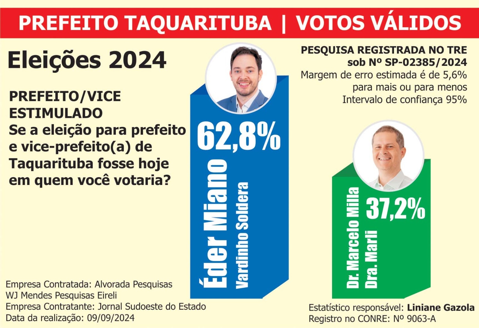 Na primeira pesquisa oficial para prefeito realizada pela Alvorada Pesquisas e encomendada pelo jornal Sudoeste do Estado em Taquarituba, o prefeito e candidato à reeleição Éder Miano (PP) lidera com folga as intenções de votos válidos com 62,8% e na segunda colocação está Dr. Marcelo Milla (PSD) com 37,2%. Líder da pesquisa, Éder tem como vice-prefeito em sua chapa o empresário Vardinho Soldera (MDB) e do Dr. Marcelo a vice é a também médica Dra. Marli (PSB).