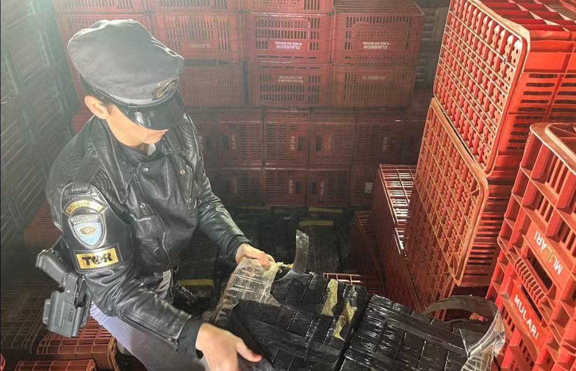 Droga estava escondida em meio a caixas plásticas vazias transportadas por caminhão baú; condutor foi preso em flagrante.