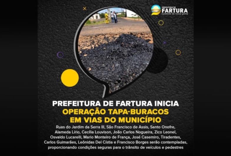 Teve início na última quinta-feira, 28 de outubro, a operação tapa-buracos em ruas do município de Fartura. O prefeito Luciano Filé visitou as obras. O objetivo, segundo o chefe do Poder Executivo, é deixar todas as ruas da cidade e a estrada vicinal em condições seguras para o trânsito de veículos e pedestres.