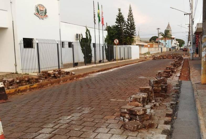 Na Rua Marechal Floriano Peixoto (Centro), está sendo feitas obras no meio fio, para arrumar o sistema de drenagem e as lajotas estão sendo removidas pra receber a pavimentação asfáltica.