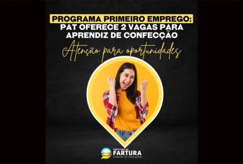 A equipe da Coordenadoria de Indústria, Comércio e Emprego, de Fartura, divulgou por meio do Posto de Atendimento ao Trabalhador (PAT), que há 2 vagas para aprendiz de confecção disponíveis. O interessado deve ter mínimo 18 anos. O órgão informa que as oportunidades fazem parte do Programa Primeiro Emprego.