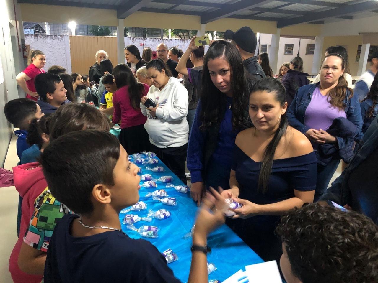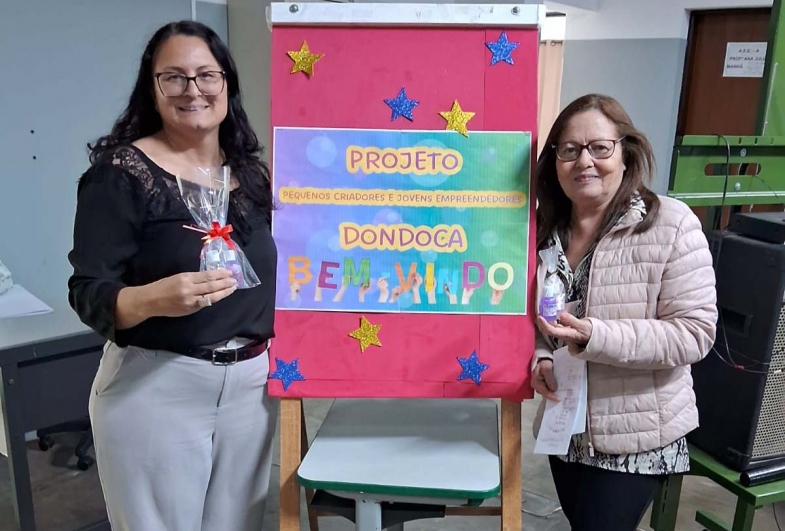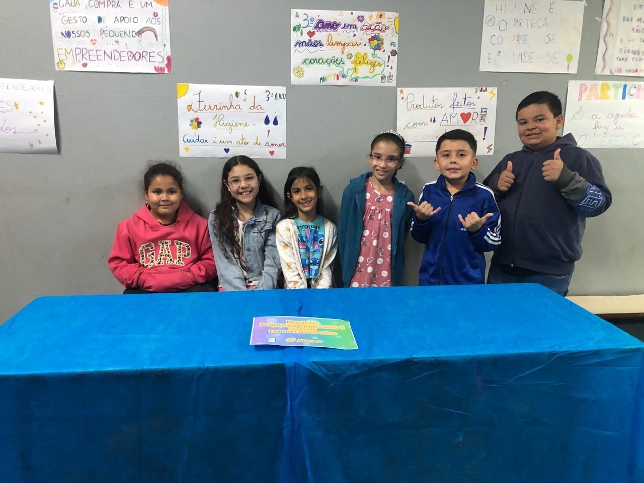 Uma feira escolar, na qual estudantes simbolicamente comercializaram produtos confeccionados em sala de aula, foi a etapa final do projeto “Pequenos Criadores e Jovens Empreendedores”.