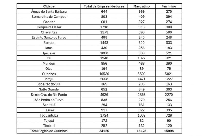 Na região, os municípios em que as mulheres ultrapassam o número de empreendedores homens são Espírito Santo do Turvo (248 mulheres e 240 homens) e Tejupá (90 mulheres e 82 homens).
