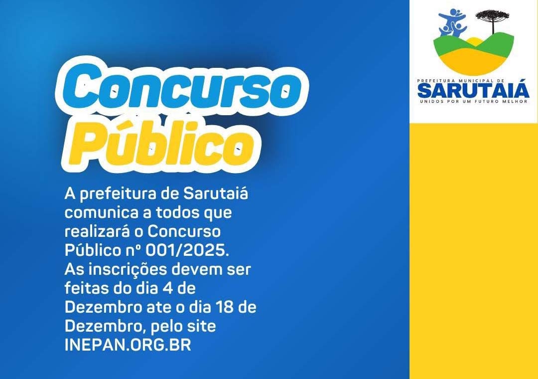 A Prefeitura Municipal de Sarutaiá anunciou que as inscrições para o Concurso Público nº 001/2025 estarão abertas a partir desta quinta-feira (4). O certame tem como objetivo preencher vagas efetivas no quadro municipal e formar cadastro de reserva para futuras necessidades.