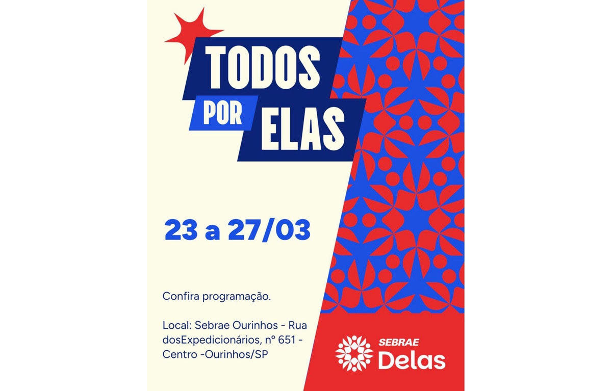 O Sebrae-SP, por meio do programa Sebrae Delas, realiza de 23 a 27 de março a Semana “Todos por Elas”, uma iniciativa especial voltada para mulheres empreendedoras de Ourinhos e região. Com entrada gratuita, o evento oferecerá palestras, oficinas, feira colaborativa, networking e atrações culturais.