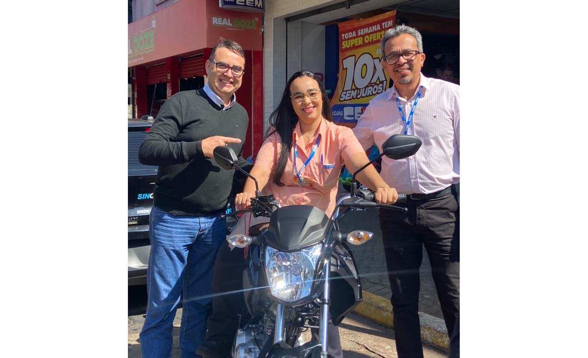 Aline Aparecida de Souza, funcionária das Lojas Cem, foi a grande vencedora da moto 0 km sorteada durante o evento Comerciário Premiado, promovido pelo Sincomerciários de Avaré em comemoração ao Dia do Comerciário, celebrado em 30 de outubro.