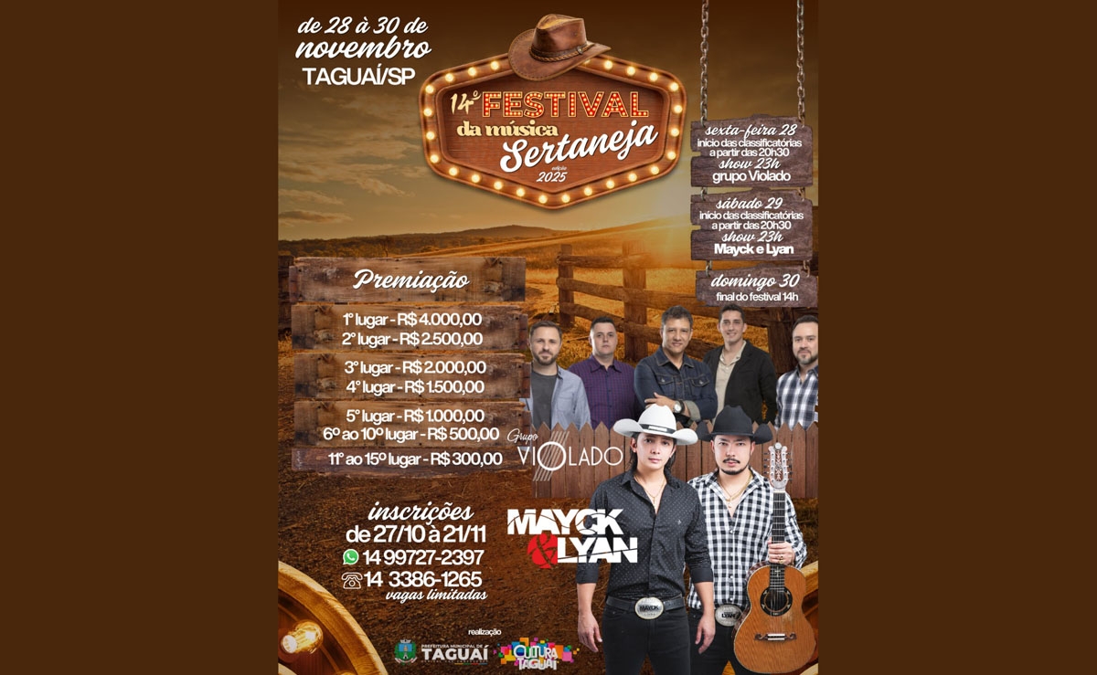 O município de Taguaí se prepara para sediar o 14º Festival da Música Sertaneja, que será realizado entre os dias 28 e 30 de novembro de 2025. O evento, que já se tornou tradição na região, promete reunir artistas e admiradores da música raiz em três dias de competição, cultura e entretenimento.