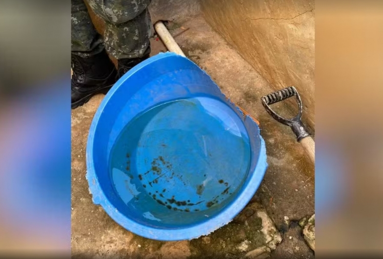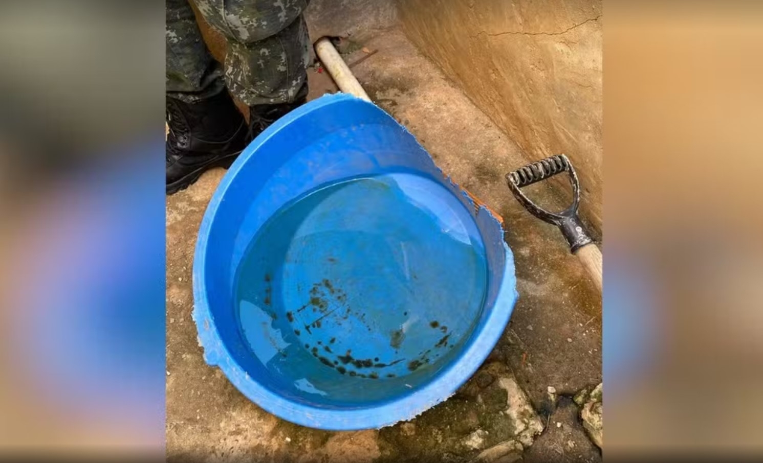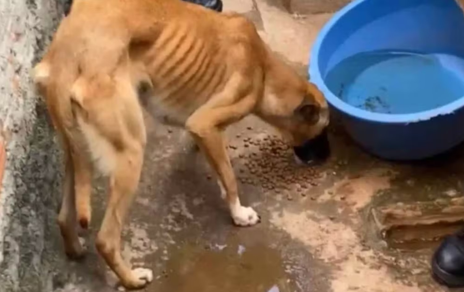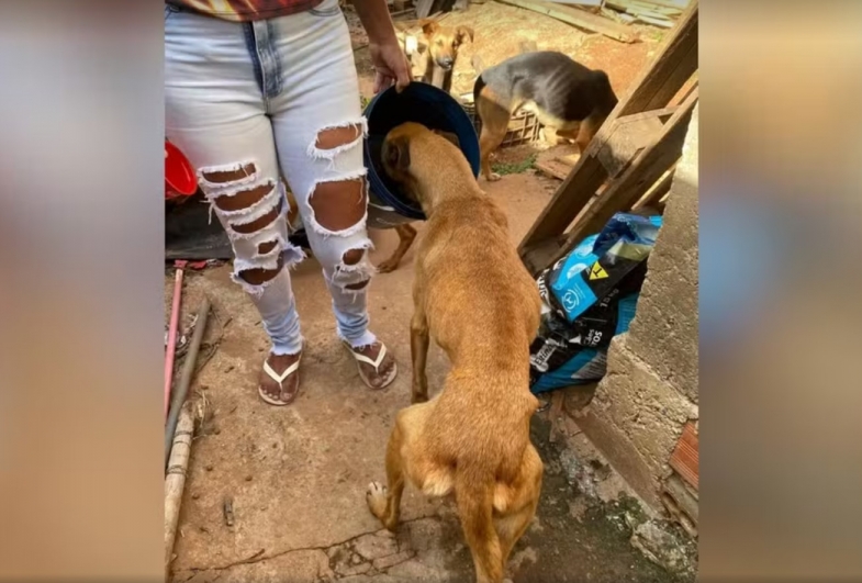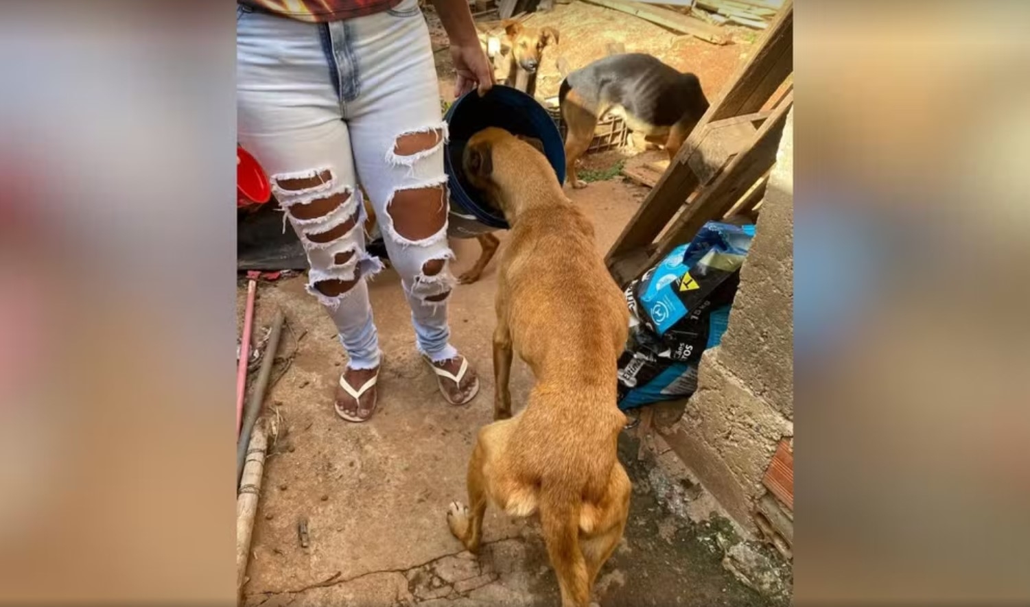 Imagens registradas no local mostram os animais com aparência magra e sem acesso à água limpa. A casa não oferecia condições adequadas, e uma bacia quebrada e suja, junto de outros materiais, ficava no espaço onde os cães estavam.