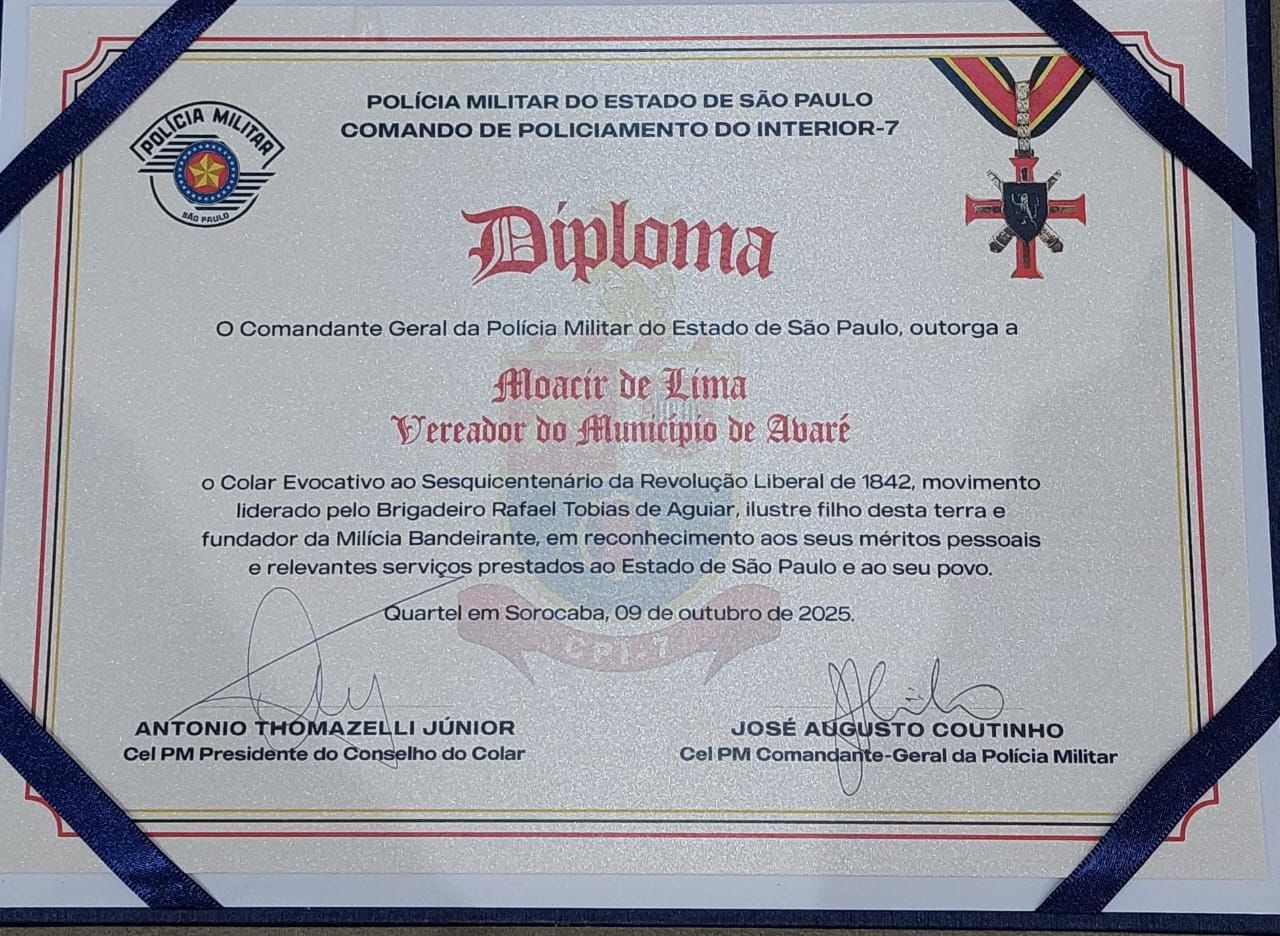 O vereador Moacir Lima foi agraciado com o Colar Evocativo ao Sesquicentenário da Revolução Liberal de 1842 nesta quinta-feira, 9 de outubro, durante uma cerimônia solene realizada no Comando de Policiamento do Interior (CPI/7), em celebração aos 150 anos do movimento histórico.